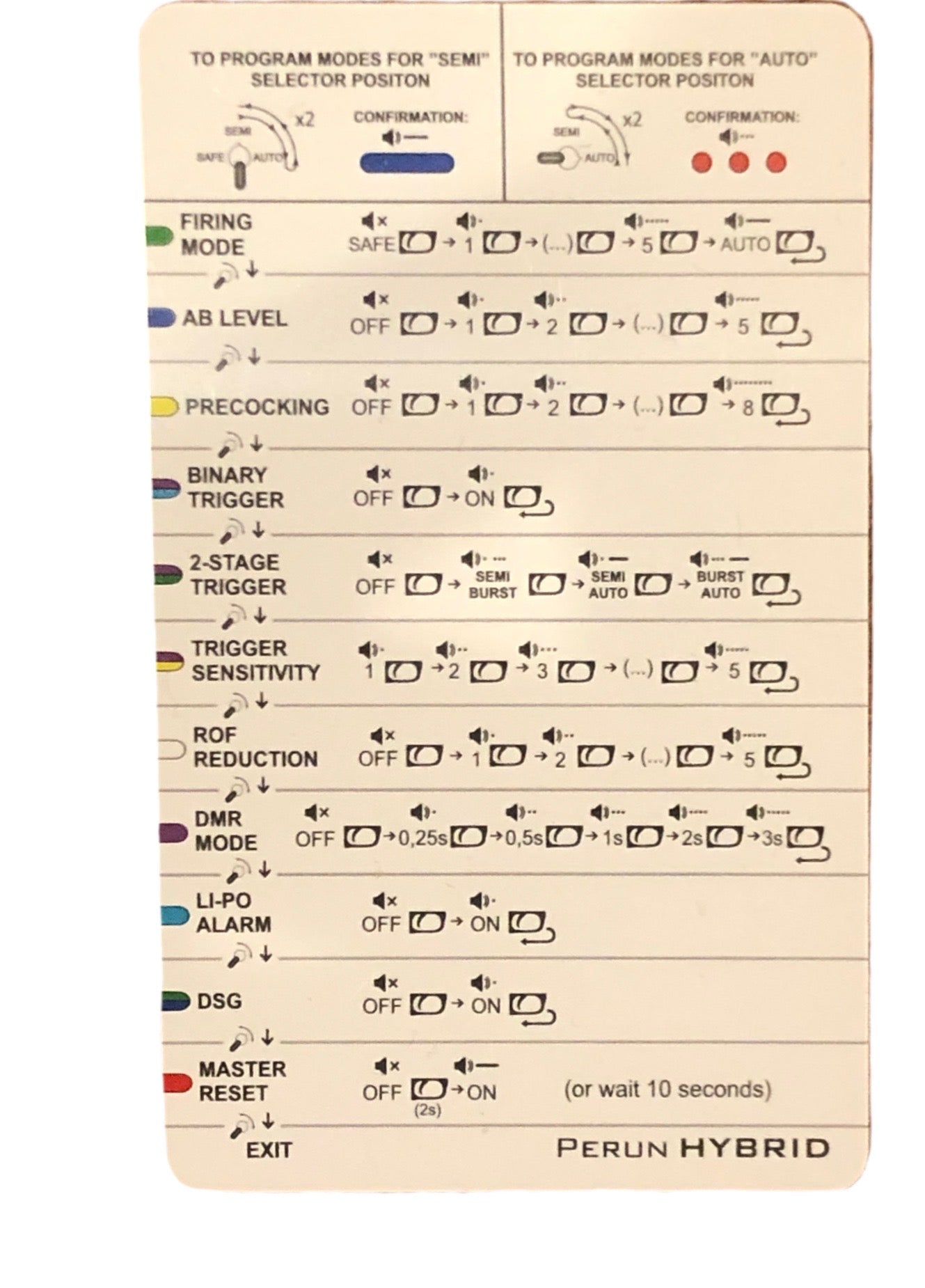 Programmable Firing modes / Adjustable Active Break Settings / Pre Cocking / Binary Trigger / 2 Stage Trigger / Trigger Sensitivity / ROF Reduction/ DMR Mode / Lipo Protection / DSG Mode