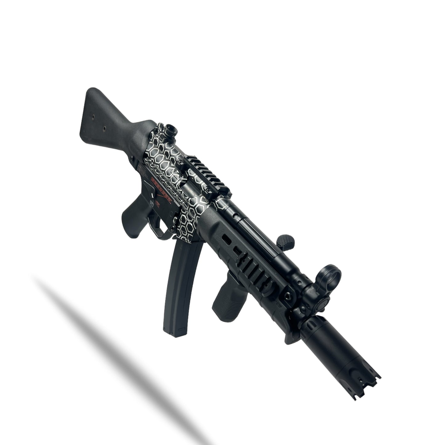 The Real Deal MP5 Hex Series is a head turning high performance Beast. Fully Upgraded Duel Sector Gear build. Based off the VFC MP5 A4. Everyone in the industry knows, if you want an MP5 platform.. you go with VFC. Fully Licensed and Trademarked, boasting a full metal upper and polymer lower. Externally we have an authentic Magpul M-Lok Handguard, Centurion Arms M-Lok Grip, Claw Mount For Optics, and a Custom Laser Engraved Hexagon Texture.